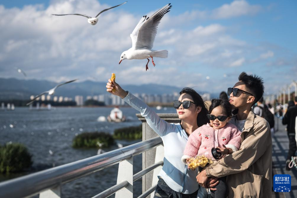 11月10日,游客在云南省昆明市海埂大坝投喂红嘴鸥。