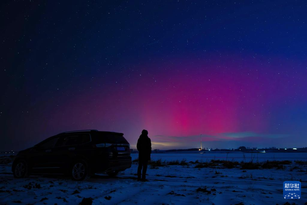 11月12日,在位于黑龙江省黑河市的北大荒集团北安分公司长水河农场有限公司,摄影爱好者在观看绚丽极光。