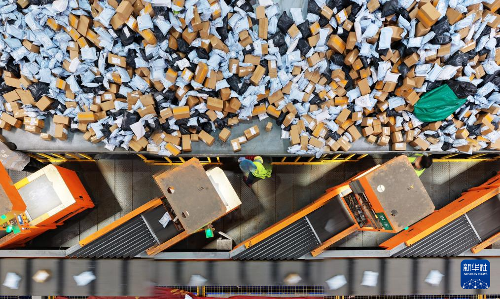 11月10日,在中国邮政集团有限公司江苏扬州邮件处理中心,工作人员在分拣快递包裹(无人机照片)。