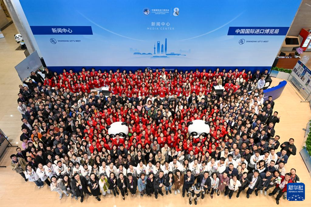 11月10日,第八届中国国际进口博览会在国家会展中心(上海)闭幕,志愿者和工作人员在进博会新闻中心合影。